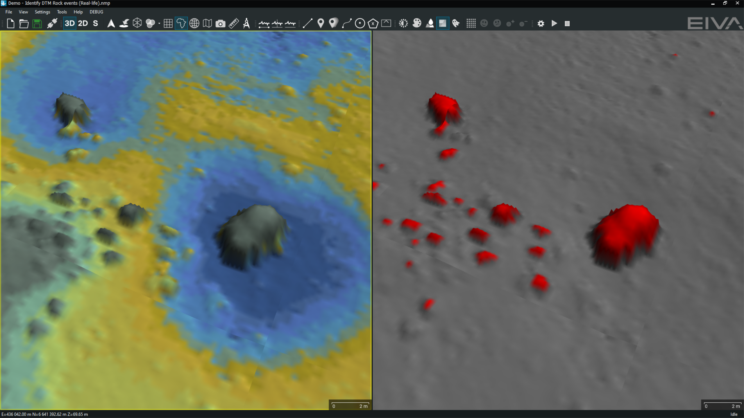 Identify rock events tool view (right) vs DTM coloured according to depth (left)