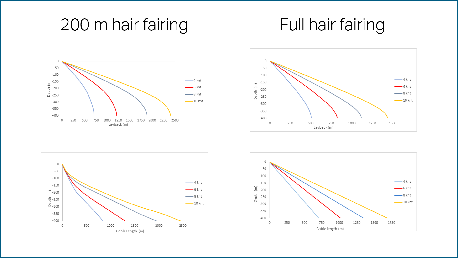 Examples of graphs for a standard ScanFish system with Ø11.43 mm cable size – these show catenary layback and cable length needed with 200 m hair fairing vs full hair fairing on tow cable