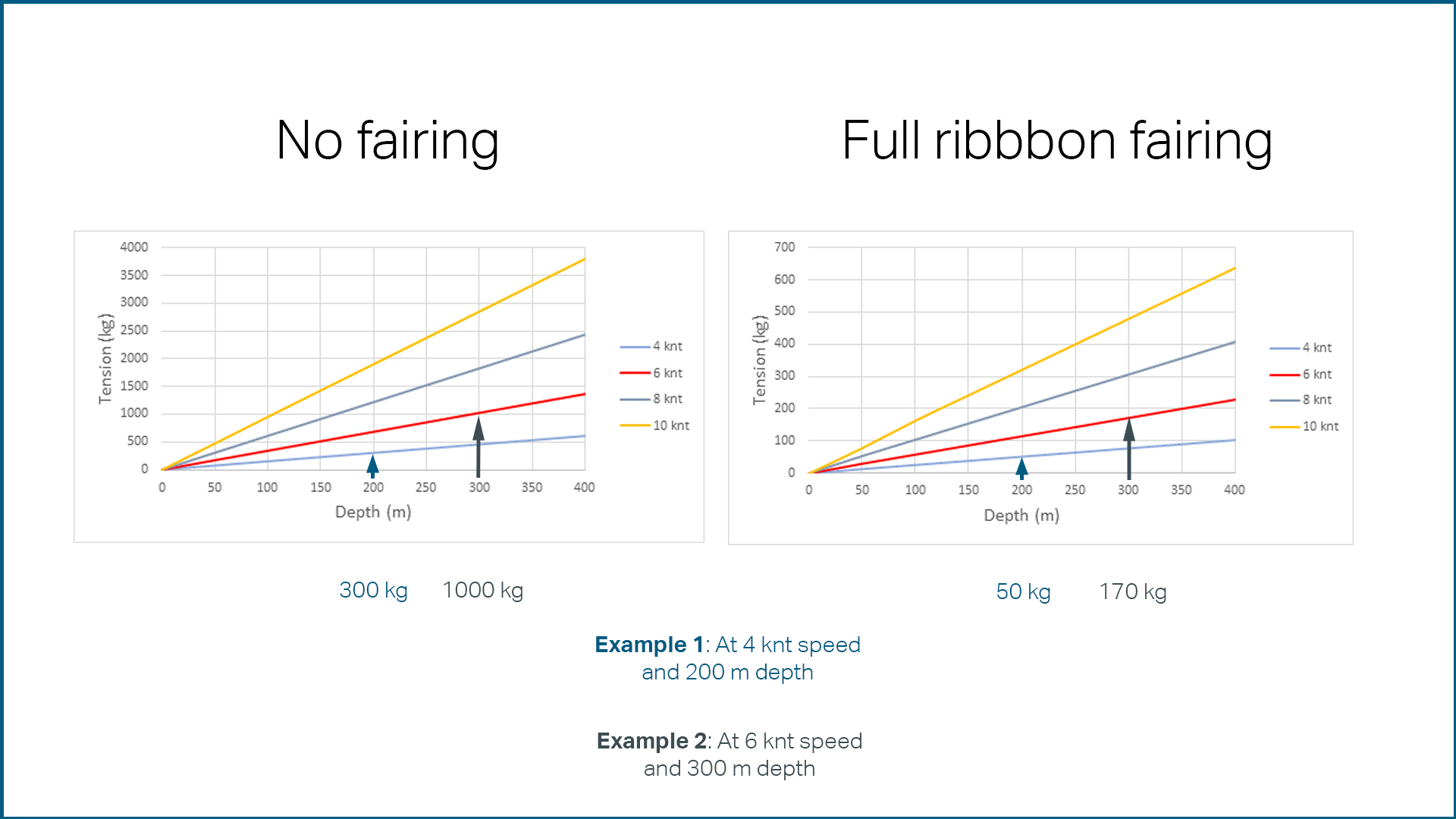 To achieve the desired low drag while staying within a budget, you may opt for fairing a section of your tow cable rather than the whole cable. To help you choose how much cable to fair for the correct effect, EIVA provides graphs of the effect different operating speeds and depths have on the tension of the system, layback and cable length needed. These are simulated calculations based on EIVA’s collected data.