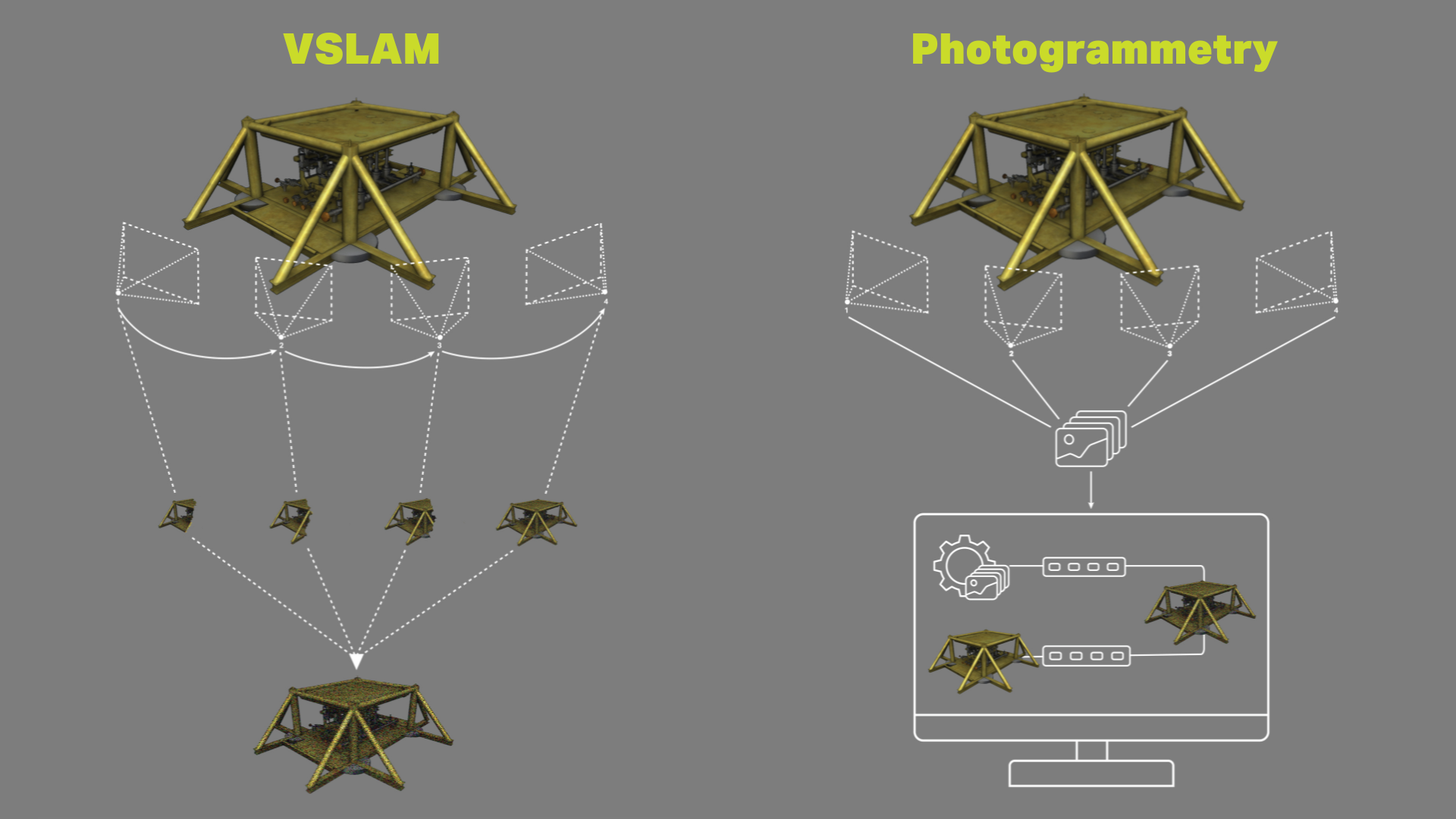 Simplified illustration showing the difference in method between VSLAM and photogrammetry. In this example, four photos are taken of a subsea object. After the first photo of the object is captured, it is input to VSLAM (left) which uses it to generate a partial point cloud, then repeats the process on the next photo captured and combines that point cloud with the previously generated point clouds in real time – the process repeats as each photo is captured. Photogrammetry (right) takes the pile of all collected photos and puts them through several steps of offline processing to generate a point cloud, then meshes the model and finally textures it.
