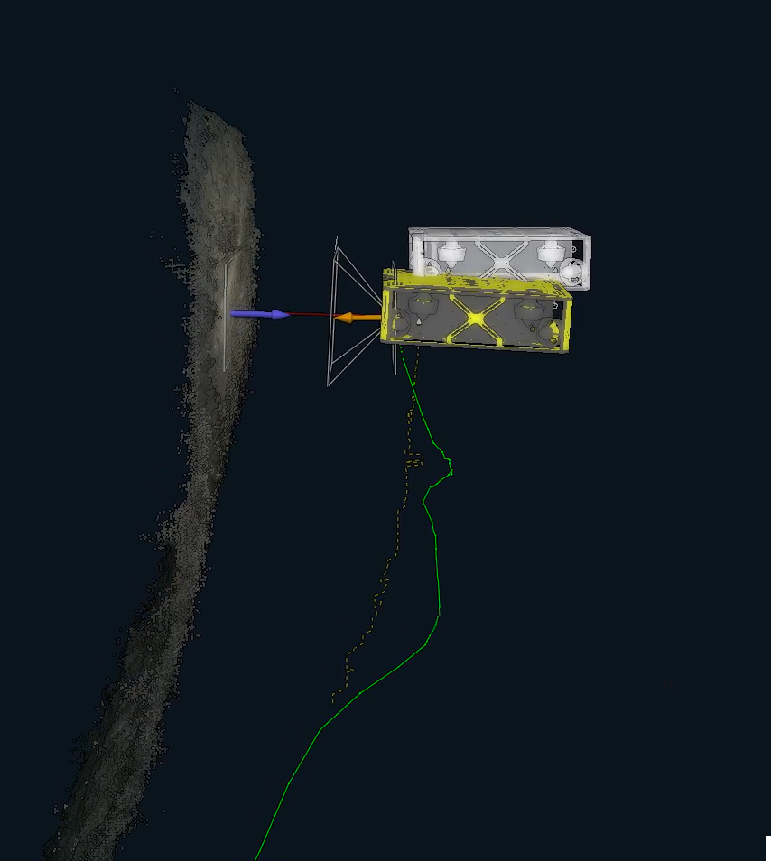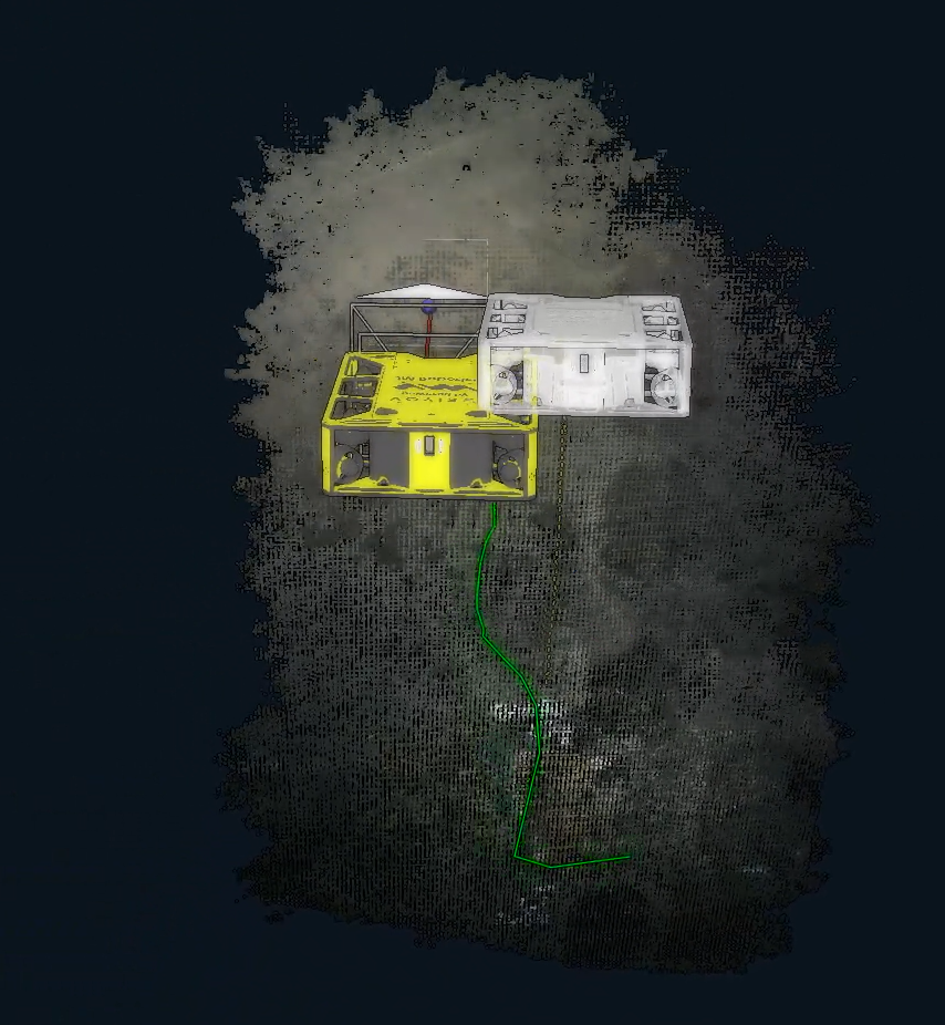 The yellow ROV shows how the manual track varies as the pilot adjusts in real time. Whereas the ghost ROV shows how autonomy keeps a stable distance from the hull.
