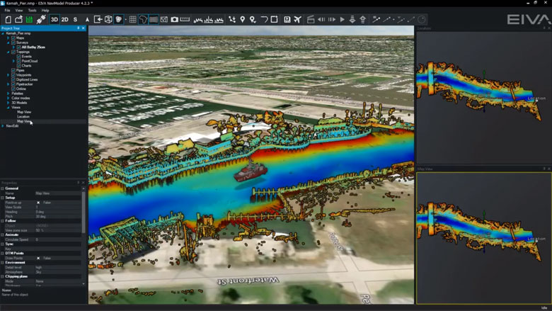 Multi-beam echo sounder, laser and sidescan will be interfaced and recorded in NaviScan. Display and quality control is easily done in HMD by using raw point clouds, terrain models or data profiles. Using multiple windows allows for QC by looking at data density, model standard deviation etc. Built in semi-automatic cleaning tool enables instant delivery or preliminary DTM.